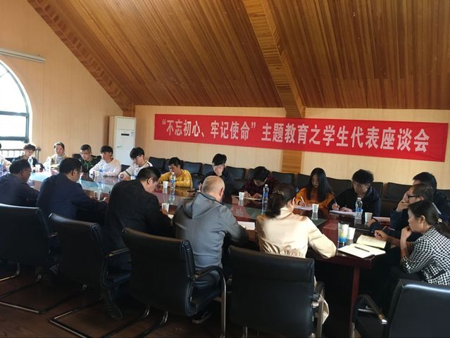 本網訊(通訊員 劉丹)2019年10月23日下午,公司在三樓會議室召開“不忘初心,牢記使命”主題教育之學生代表座談會。公司總經理來靖德、黨總支書記王水斌、副總經理陳武,法商學院黨委副書記、副院長楊宏斌、學工部郝傳策、保衛、武裝部張寶魁及11名法商學院學生代表參加了會議。