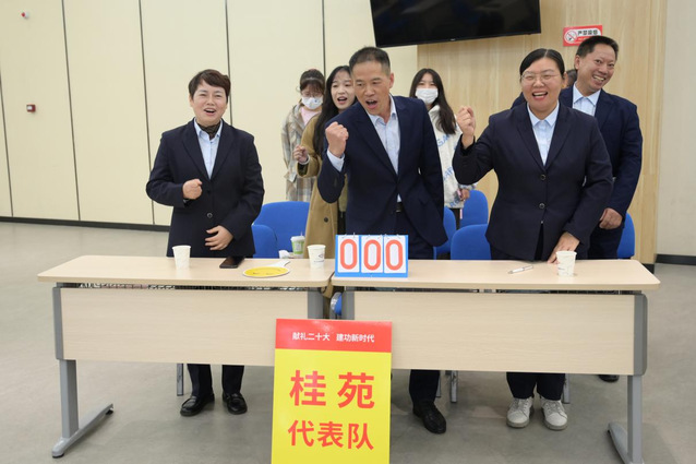 緊接著開始了團(tuán)體項目“公寓知識我知道”,公寓服務(wù)部結(jié)合自身特點和工作實際,內(nèi)容覆蓋了管理員崗位、各類常規(guī)及特殊問題。參賽隊伍分別有桔苑代表隊、櫟苑代表隊、楓苑代表隊、梅苑代表隊、竹苑代表隊、桂苑代表隊,每隊有3名參賽選手,5-6名未上場的管理員及學(xué)生代表組成的親友團(tuán)。比賽開始前各隊進(jìn)行了風(fēng)采展示,在學(xué)生助力的加持下,喊出了各隊的特點和氣勢,贏得了現(xiàn)場陣陣掌聲。比賽過程中,各參賽隊沉著冷靜,充分展現(xiàn)日常知識水平及個人風(fēng)采,員工們相互學(xué)習(xí),抓要點、找差距。