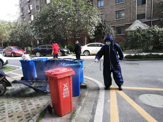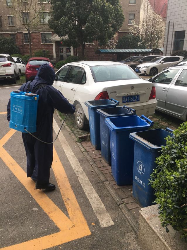 “這樣的一大桶水,要配上500g的漂白粉,攪拌均勻,如果要預防性消毒完整個區域,需要五大桶”。消毒隊長王定泳面帶微笑的邊說邊攪拌著。他從疫情防控初期連續在崗30天,從開始消殺知識的空白到現在的從容應對,藥物配置、消殺培訓、入戶消毒,他都親力親為。每天上午8點,王定詠、李廣早、吳德平、景運武四人背上約40斤消毒噴霧器,對小區公共區域、樓道、垃圾桶、電梯轎廂、進行消毒,連續工作七八個小時,從不叫苦叫累,由于長時間使用消毒劑,呼吸道受到了嚴重刺激,嗓子疼的水都無法下咽,可是他們心里明白,這是物業人的職責所在,仍然義無反顧沖在疫情防控第一線。整個消毒過程下來,這群平均年齡近60歲的人,個個后背汗濕、渾身酸痛,消毒隊員吳德平在消殺工作中因出汗太多導致感冒低燒,在家隔離14天無異常后又匆匆返回崗位。遇到小區有發熱病人時,他們也沒有退縮,進入住戶家中認真消毒完才離開,住戶要求自行消毒的就主動送物資上門,并積極宣傳消殺的各個環節。