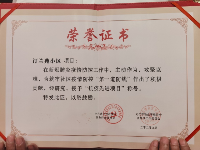 本網(wǎng)訊(通訊員 高瑋) 9月25日下午,武漢市物業(yè)管理協(xié)會江夏區(qū)工作委員會2019年度總結(jié)暨2020年度抗疫先進表彰大會在宜昌隆重舉行。大會表彰了武漢市物業(yè)管理協(xié)會江夏區(qū)工作委員會抗擊新冠肺炎疫情先進企業(yè)、先進項目、先進黨員、先進個人。公司再獲抗疫先進企業(yè)稱號,汀蘭苑獲評抗疫先進項目稱號,王水斌、高利霞、黃健超獲評抗疫先進黨員,王定詠、吳鳴獲評抗疫先進個人稱號。
