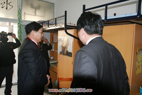 (吳教授在相關人員的陪同下參觀學生公寓)