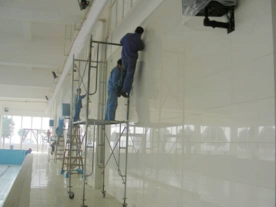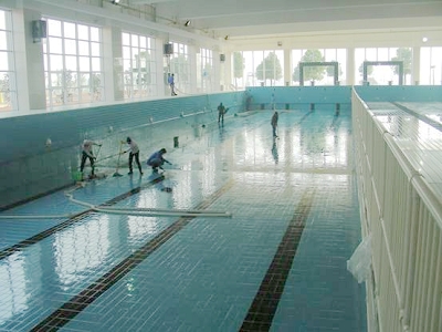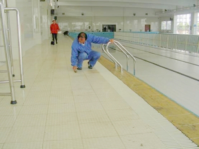 本網訊(通訊員魏秀英攝影報道)校游泳館是我校今年新建項目,也是迎評的考察點之一,為了保障其順利開館以便正常教學工作的開展,2007年11月6日—10日,應體育教學部要求及公司領導安排,我部門組織保潔員工對游泳館進行了全面的保潔開荒工作,成為游泳館的第一美容師。