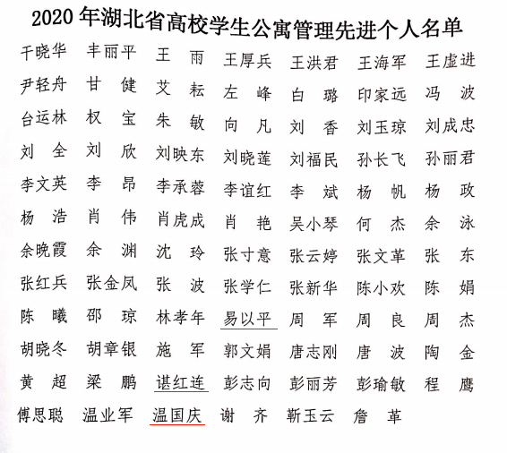 本網訊(通訊員 汪子欣)2020年12月7日,湖北省高等學校后勤研究會印發了“關于表彰2020年湖北省高校學生公寓管理先進單位和先進個人的決定”。我校榮獲“湖北省高校學生公寓管理先進單位”榮譽,桔九管理員易以平、桔五管理員諶紅連以及桂一管理員溫國慶榮獲“湖北省高校學生公寓管理先進個人”榮譽。