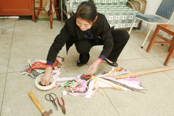 本網(wǎng)訊(通訊員 魏秀英)剪裁好的布條一字排開,一根鐵絲綁著棍子繞個圈,釘子一緊,幾件零散的東西瞬間變成了一把美觀、牢固的拖把,這就是物業(yè)服務(wù)部西區(qū)保潔班長聶春香的“巧手魔法”。