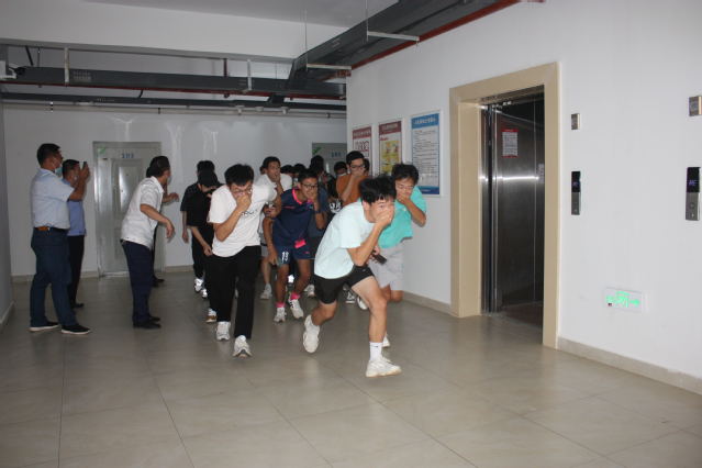 下午3點整,在楓1門口小廣場,隨著保衛處長姚自平“活動開始”的一聲令下,工作人員立即開啟設置在楓1學生公寓4樓的煙霧發生器模擬火災場景,同時按下樓內的2個手動火災報警按鈕,頓時楓1樓內警鈴大作、應急廣播響起,聲光報警裝置、排煙裝置等消防設施陸續啟動,樓內學生迅速靠右沿疏散通道捂鼻、彎腰有序疏散,學校及公司義務消防隊員8人立即進入楓1各樓層開展“搜救工作”,帶領未及時疏散的學生離開樓棟。3點10分,楓1樓內所有學生及義務消防隊員全部疏散至門口小廣場列隊等待下一項活動,整個疏散過程安全、迅速、有效。
