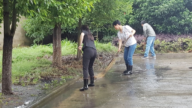 本網(wǎng)訊(通訊員 高瑋)6月1日,暴雨突襲武漢,強勁的暴雨導(dǎo)致路面積水難以擴散,我校圖書館、智慧園與桂苑學(xué)生公寓、公租房門口不同程度受災(zāi)。滯水情況發(fā)生后,公司領(lǐng)導(dǎo)高度重視,上午8點半,總經(jīng)理來靖德、黨總支書記王水斌、副總經(jīng)理陳武、廖挺在各個受災(zāi)區(qū)域親臨一線,靠前指揮,現(xiàn)場指導(dǎo)疏通排水工作。物業(yè)服務(wù)部、公共事務(wù)部、公寓服務(wù)部等部門負責人第一時間組織員工投入排水去污工作,為各個區(qū)域的正常生活、學(xué)習(xí)秩序提供穩(wěn)定的后勤服務(wù)保障。