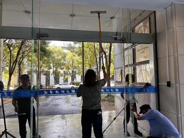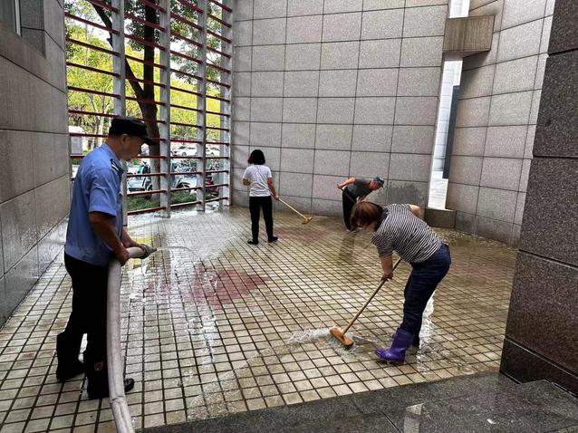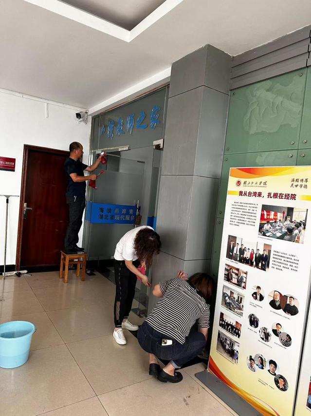 物業服務部集中開展教學教輔區環境整治工作,做好衛生大掃除,加強服務區域內門廳及走廊玻璃、樓梯扶手、欄桿、門窗、桌椅、宣傳欄、走道墻面清潔打掃,及時清理區域內廢棄雜物;重點對法商綜合樓、實訓中心等區域內教室及臺灣博士公寓樓樣板房進行細節保潔;加強日常巡查,規范服務區域內門口非機動車輛停放秩序,確保臺灣周工作順利開展。