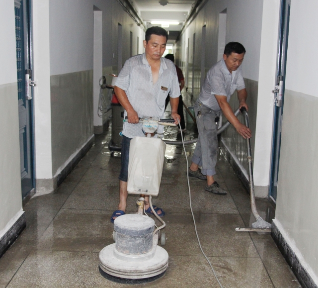 在學校北大門口,公司三名接待人員頭頂烈日,依然堅持在工作崗位上,為前來報道的選調生提供咨詢服務;在國際學術交流中心,三名身穿藍白條紋上衣的工作人員,正在為現場來報到的選調生工作人員及輔導員辦理入住接待手續(xù);在大學生活動中心,公司安排專人為選調生發(fā)放文化衫、文具、工作牌、培訓資料、校園卡(門禁卡)等,現場銜接各項事宜;在學生公寓大廳,公寓管理員正在為選調生辦理入住登記手續(xù),發(fā)放《溫馨提示》;在竹一、二棟學生公寓走道,物業(yè)服務部派出30余名保潔人員正在對裝修后的公寓走道清洗,有的用洗地機清洗、有的用拖把拖,有的正在用水沖,現場一片忙綠的景象,盡管汗水濕透了衣背,大家仍在堅持工作。穿梭在東區(qū)櫟苑、桔苑、西區(qū)竹苑之間的還有維修人員,卡式門鎖、熱水、空調、售貨機等生活服務后勤保障人員,大家不畏高溫、不懼辛苦,只為給選調生提供舒適的生活服務。
