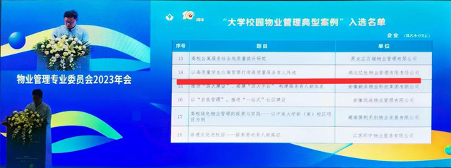 在全國物業(yè)管理專業(yè)委員會2023年年會暨中國校園物業(yè)管理高質(zhì)量發(fā)展論壇上,中國教育后勤協(xié)會發(fā)布了全國高校后勤系統(tǒng)“大學(xué)校園物業(yè)管理典型案例”入選名單,億優(yōu)物業(yè)公司公寓服務(wù)部憑《以高質(zhì)量學(xué)生公寓管理打造高質(zhì)量服務(wù)育人陣地》的優(yōu)秀實(shí)踐案例成功入選。全國共有18家物業(yè)管理企業(yè)入選,億優(yōu)物業(yè)公司為湖北省物業(yè)管理企業(yè)唯一一家。