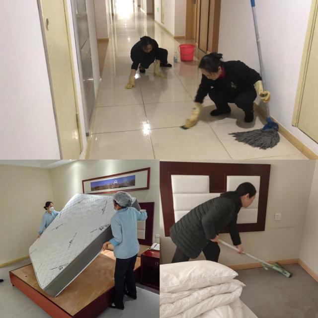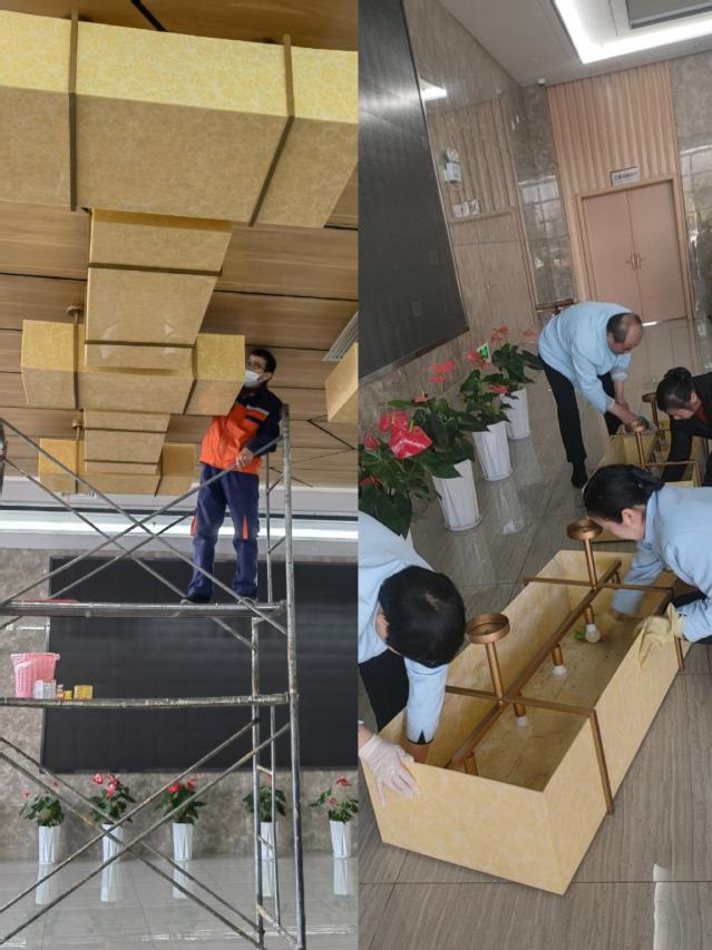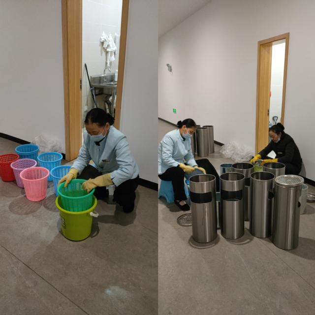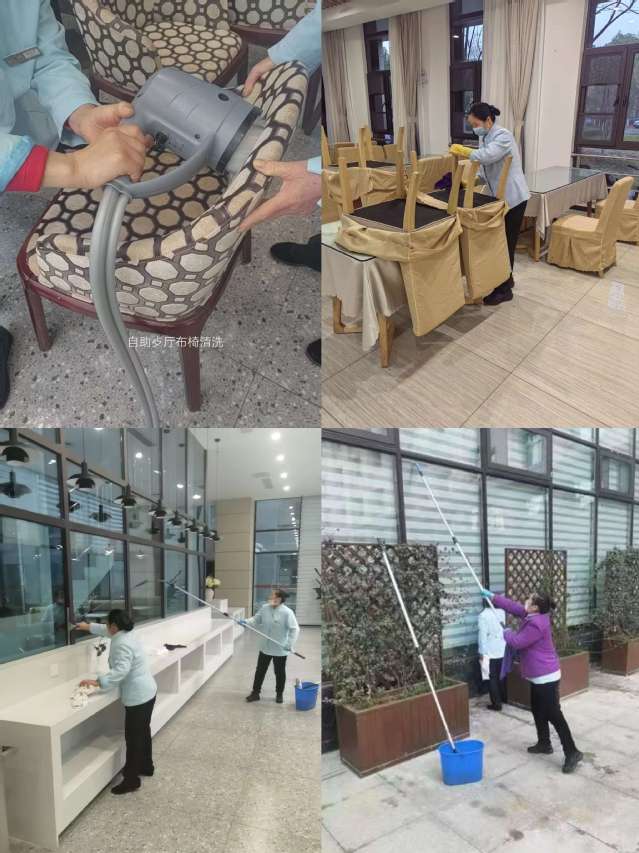 餐飲部在繼續(xù)做好盒飯供應工作的同時,按計劃進行區(qū)域內外玻璃刮洗,桌面、地面以及消毒柜、冷藏柜的徹底清潔,餐具、廚具的消毒,燈具燈桿的抹塵,各項工作均有條不紊進行。除此之外,還用沙發(fā)布藝清洗機高溫清洗了二號自助餐廳120張布椅,清理了一號自助餐廳110張餐椅腳,確保餐廳區(qū)域內各處都窗明幾凈、一塵不染。