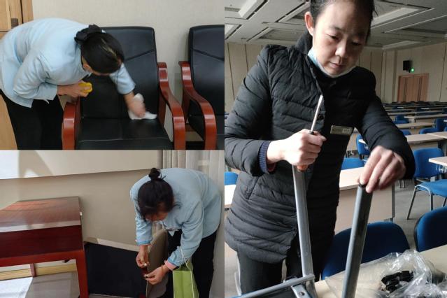 會議管家除了完成日常會議接待服務外,利用空閑之余將會場所有會議桌椅進行逐一檢查保修,對已磨損桌椅腳墊進行更換。