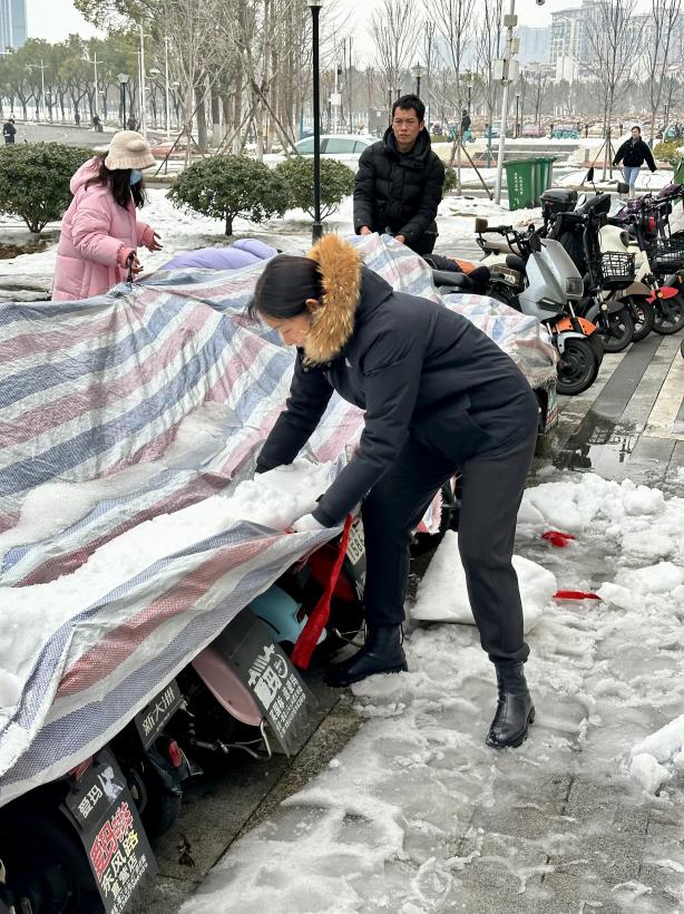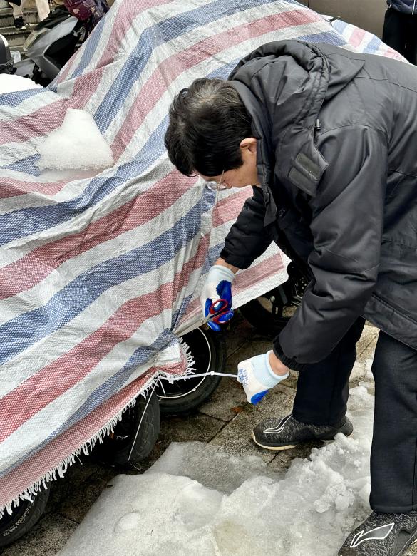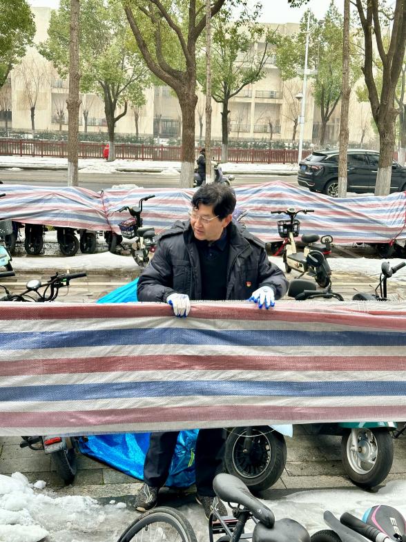 由于寒假期間天氣惡劣,遮雨布上覆蓋一層厚厚的霰,增加了本次志愿服務活動的難度。活動伊始,全體黨員緊密配合,一組黨員手持剪刀,將遮雨布與非機動車繩索固定處剪斷,另一組黨員緊跟其上,將遮雨布上的霰清理下來,隨后合作將遮雨布整齊疊好,雖然天寒地凍,大家干勁十足,工作熱情絲毫不打折扣。